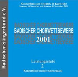 Chor- und Liedverzeichnis:Pfl. = PflichtchorW. = WahlchorV. = VolksliedSingkreis Ettlingen e.V. 1957Leitung: Thomas Seyboldt1: Pfl.: Vater unser (Heinrich Roos)2: W.: Il est bel et bon (Pierre Passerau)3: V.: In stiller Nacht (Johannes Brahms)GV Frohsinn Büchig e.V.Leitung: Klaus Völker4: Pfl.: Ich ging emol spaziere (Gunther Erdmann)5: W.: Sensemaya (Harald Genzmer)6: V.: Es ging ein dunkle Wolke herein (Hugo Distler)MGV Eintracht 1860 NeufrachLeitung: Dieter Gebauer7: Pfl.: Buch des Lebens (Bernhard Weber)8: W.: St. Paulus war ein Medicus (Karl-F. Zelter)9: V.: In einem kühlen Grunde (Friedrich Silcher)Chor Cantamus des Liederkranz Buchen 1842Leitung: Erhard Wüst10: Pfl.: Ich ging emol spaziere (Gunther Erdmann)11: W.: Contrapunto bestiale alla mente (Adriano Banchieri)12: V.: Sur le pont d‘Avignon (Heinz Lemmermann)Junger Chor des Mittelbad. SängerkreisesLeitung: Günther Siegwarth13: Pfl.: Ich ging emol spaziere (Gunther Erdmann)14: W.: Vineta op.42, Nr.2 (Johannes Brahms)15: V.: Dein Herzlein mild (Johannes Brahms)Ensemble 96 des GV Freundschaft DurmersheimLeitung: Bernd Stephan16: Pfl.: Das Vater unser (Heinrich Poos)17: W.: La Blanche neige (Francis Poulenc)18: V.: Der tote Knabe (Johannes Brahms)MGV Badenia e.V. Reichenau 1877Leitung: Wolfgang Feucht19: Pfl.: Buch des Lebens (Bernhard Weber)20: W.: Liljekonvalje (David Wikander)21: V.: Zum Tanze da geht ein Mädel (Hugo Alfven)GV Freundschaft Würmersheim e.V. 1904Leitung: Daniela Brem-Hohenöcker22: Pfl.: Das Vater unser (Heinrich Poos)23: W.: Der bucklichte Fiedler (Johannes Brahms)24: V.: Die launige Forelle (Franz Schöggle)MGV 1876 Allmendshofen e.V.Leitung: Hubert Stinner25: Pfl.: Buch des Lebens (Bernhard Weber)26: W.: Türkisches Schenkenlied (F.M-Bartholdy)27: V.: In einem kühlen Grunde (Harry Frommermann)MGV Eintracht 1844 Bötzingen e.V.Leitung: Dieter Agricola28: Pfl.: Buch des Lebens (Bernhard Weber)29: W.: Chinesisches Trinklied (Harald Genzmer)30: V.: Lauf Jäger, lauf (Wilhelm Heinrichs)Männerchor des Nikolaus-Kistner- Gymnasium MosbachLeitung: Christof Roos31: Pfl.: Musik (Harald Heilmann)32: W.: Veris dulcis in tempore (Orlando Dipiazza)33: V.: Plaisir d‘amour (Dan-Olof Stenlund)